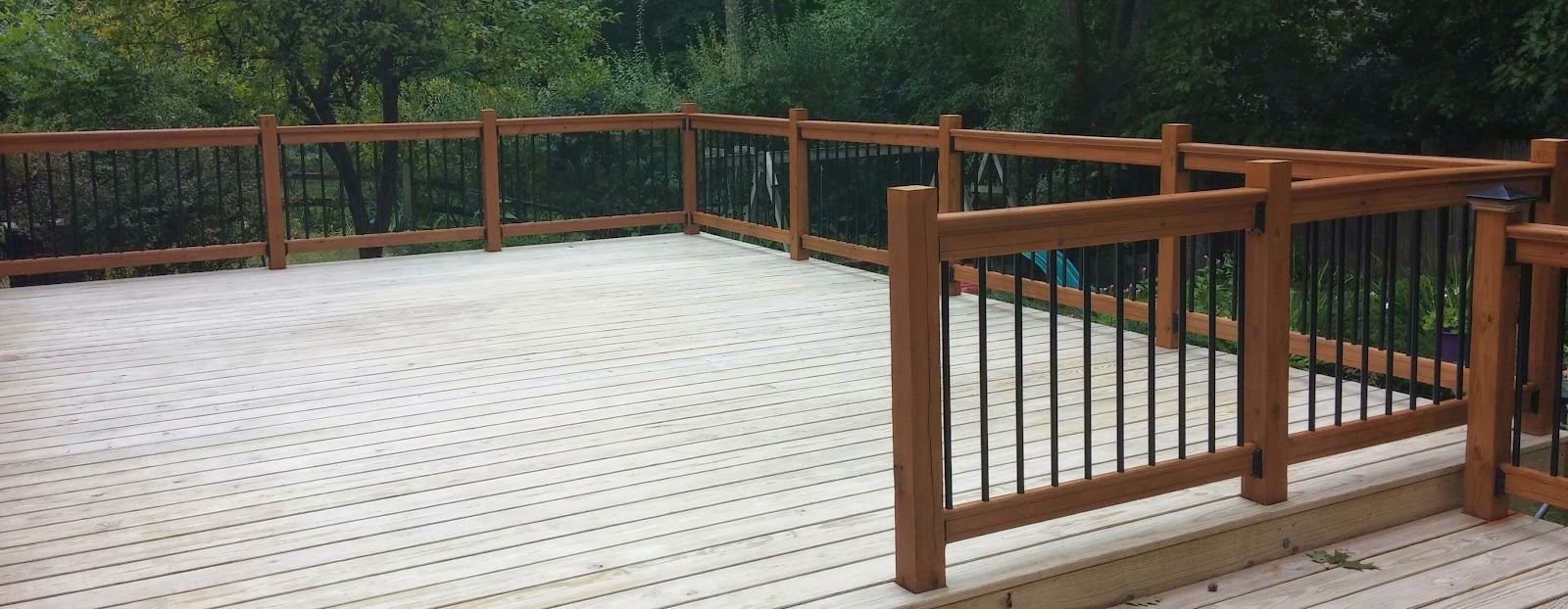 After allowing the pre-treated lumber to dry out enough to accept the stain/sealer we waited for a full year before finishing our deck. We chose Olympic Maximum Stain Sealant in the color "Sierra" - a semi-transparent stain/sealer-in-one.